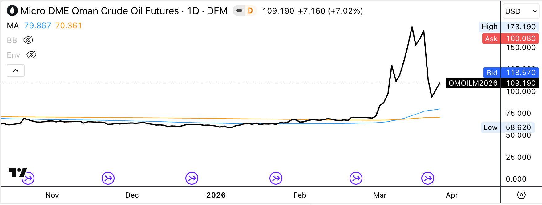 El precio del petróleo omaní refleja lo que compradores desesperados están dispuestos a pagar por asegurarse el suministro energético. Si el conflicto no se resuelve pronto, el Brent podría alcanzar niveles similares.