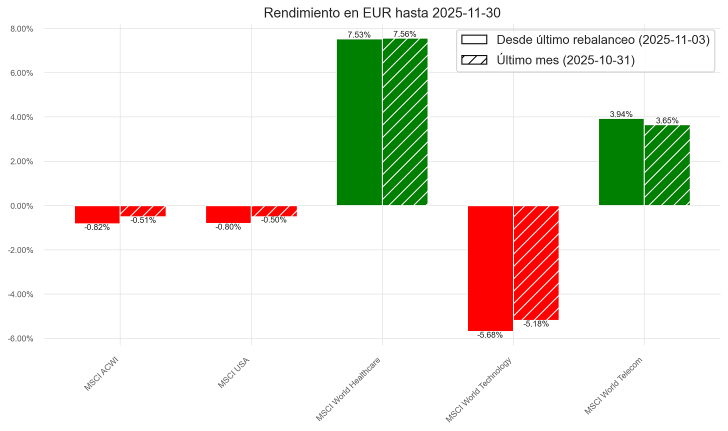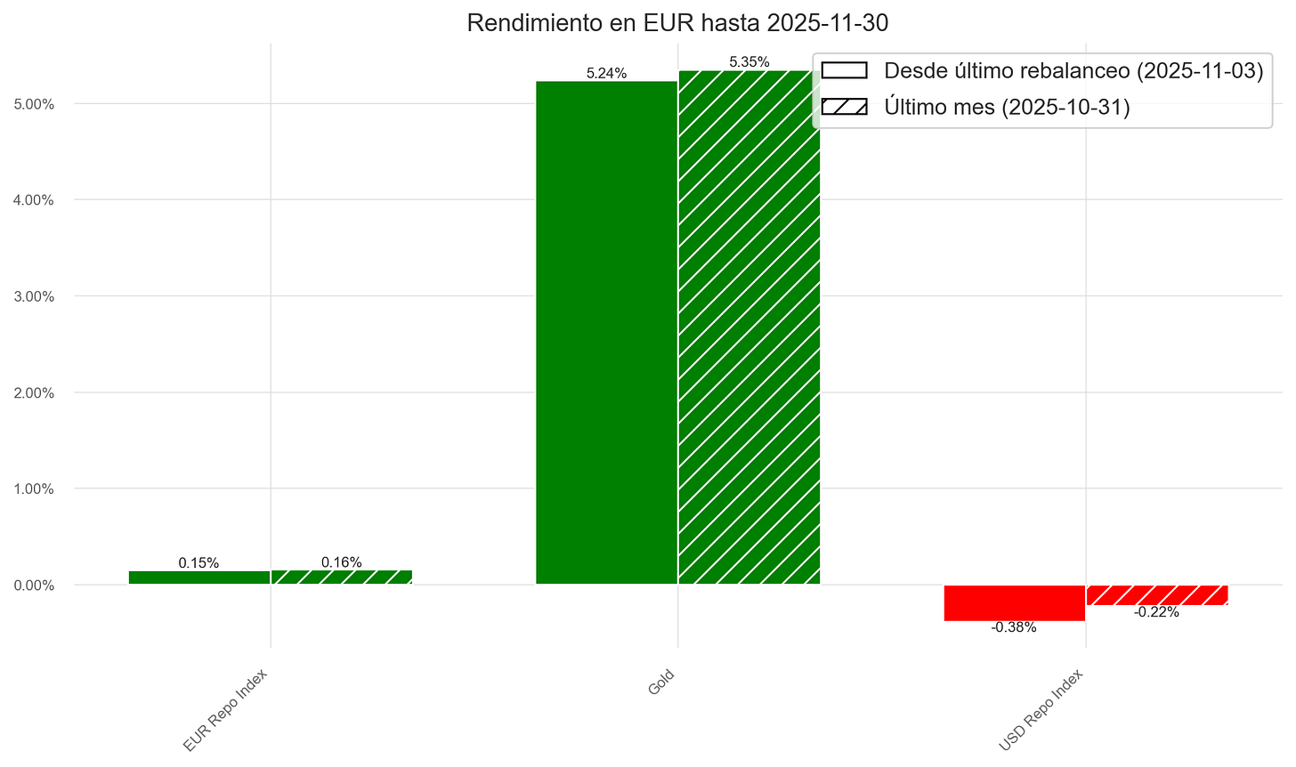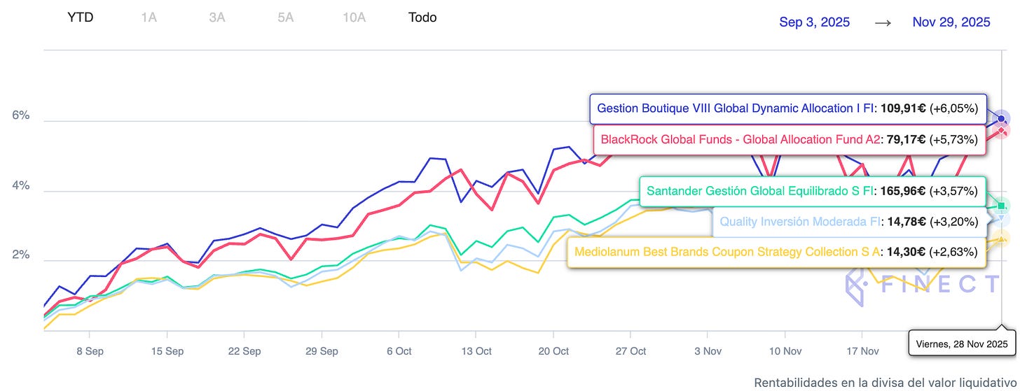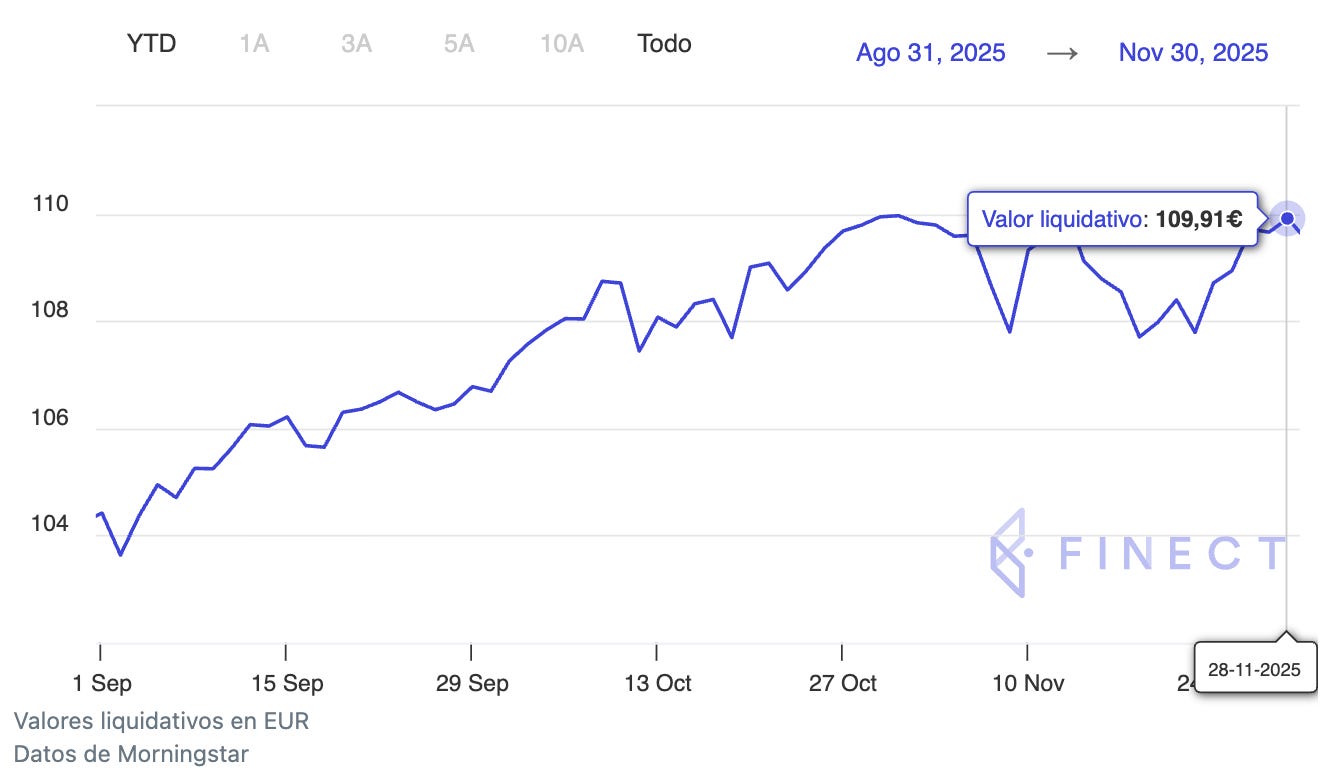 A pesar de las caídas en renta variable y fija del mes de noviembre, el fondo registró una ligera revalorización del +0,07 %, acumulando un +5,26 % en los últimos tres meses y un +10,08 % desde el 5 de mayo de 2025, fecha en la que empecé a asesorar al fondo en materia de inversión.