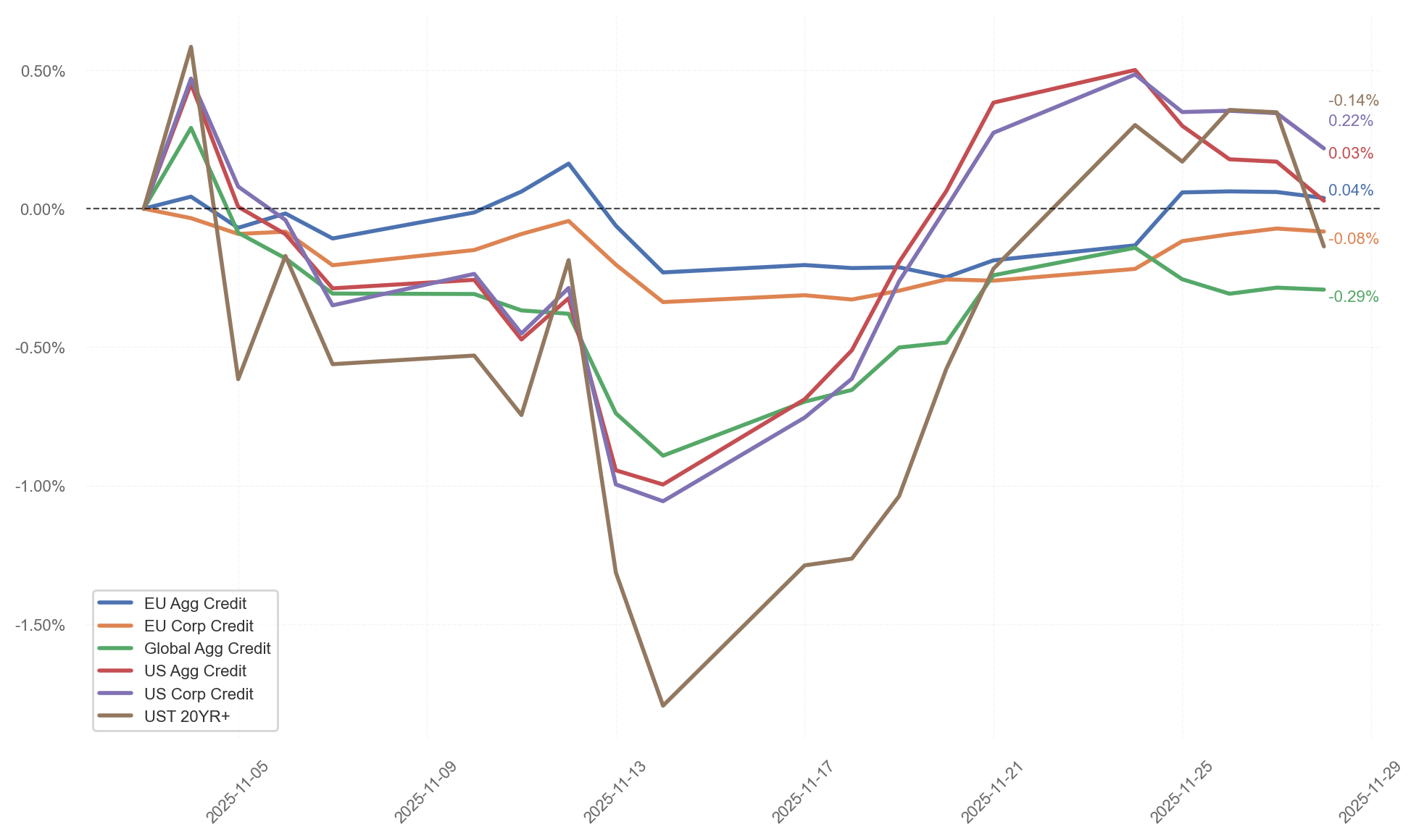 A principios de mes vimos a un presidente de la FED con un tono claramente hawkish, sin confirmar el recorte de tipos de diciembre, lo que provocó una fuerte caída en la renta fija.