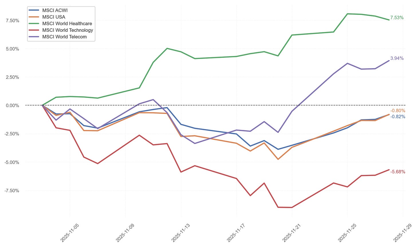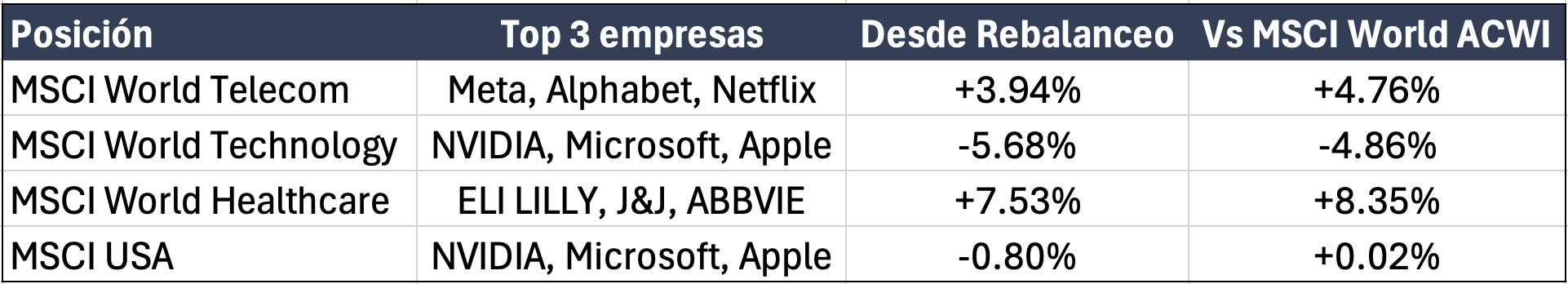 La posición que más nos ha beneficiado ha sido la de MSCI World Healthcare, con una subida de +7.53% este mes. Mientras que la peor ha sido MSCI World Technology con una caída de -5.63% lastrando considerablemente la rentabilidad de la cartera.