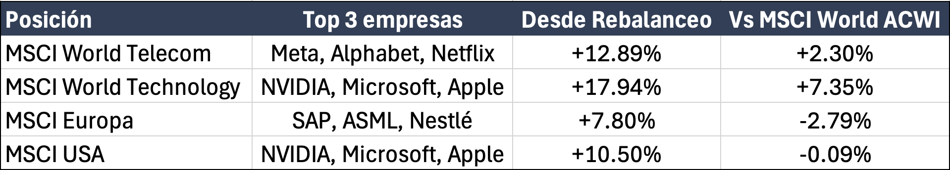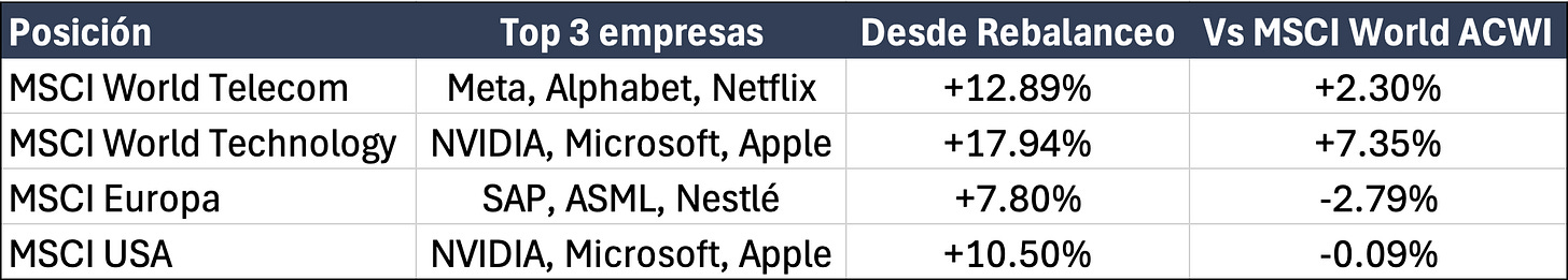 Con estos ajustes tácticos, tenemos exposición a sectores defensivos como sanidad y telecomunicaciones, y al mismo tiempo a la economía y sector que lideran la revolución tecnológica.
